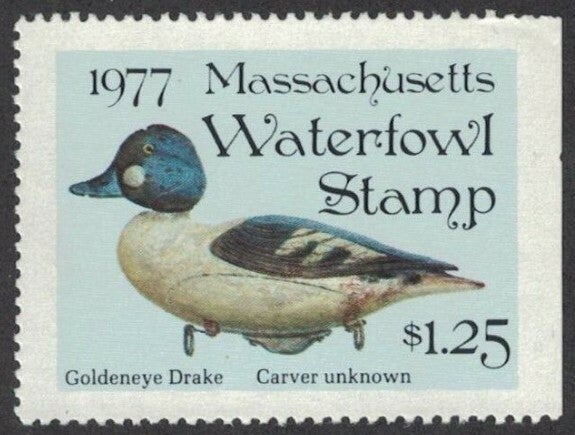 Birds 1977 USA Massachusetts Ducks (Bucephala clangula) Common Goldeneye Decoy waterfowl stamp 1 side imperforated r